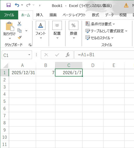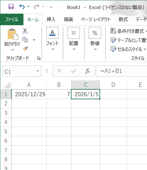 「A1の日付に、B1の日数を足す」