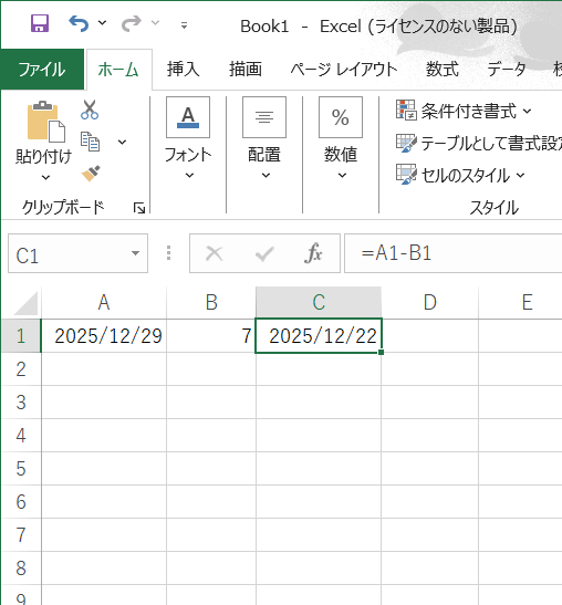 - A1セル:基準となる日付(例:2025/12/29)