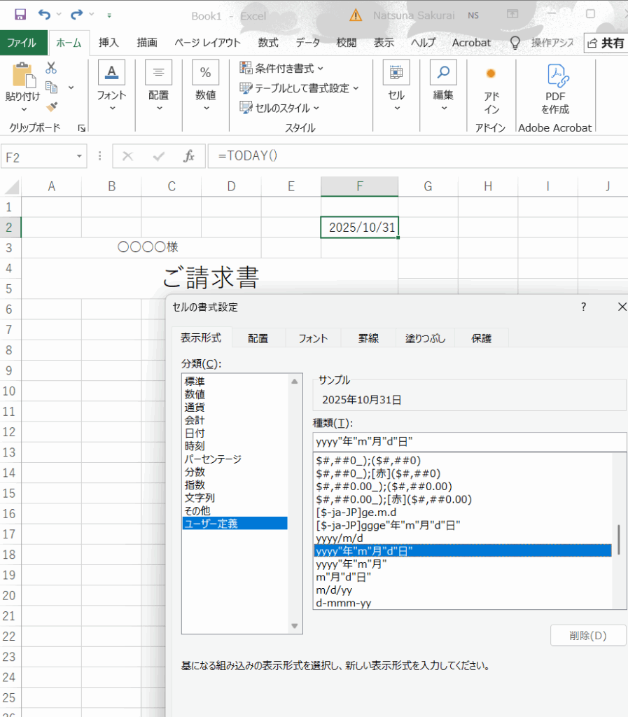 もし「2025年10月23日」のように、日本語表記にしたい場合は、表示形式を変更します。