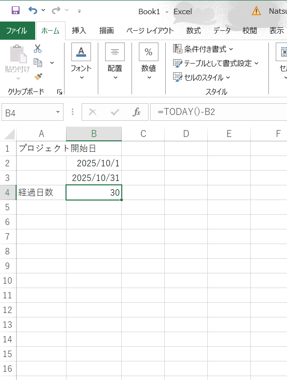 たとえば、開始日がB2セルに入力されている場合、次の数式で経過日数を計算できます。